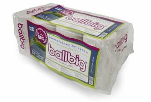 Ballbig wc-paperi on riittoisaa, joka rullassa on 400 kaksinkertaista arkkia. 16 rl:n säkki painaa 3 kg eli saman kuin "tavalliset" 32 rl:n säkit. Tuote menee pienempään tilaan, on laadukasta ja suomalaista!